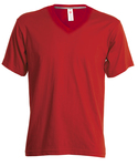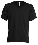 Short sleeve V-neck T-shirt, 1,5cm ribbed collar in spandex blended fabric and top-stitching on the front, reinforcement tape from shoulder to shoulder, tubular structure.